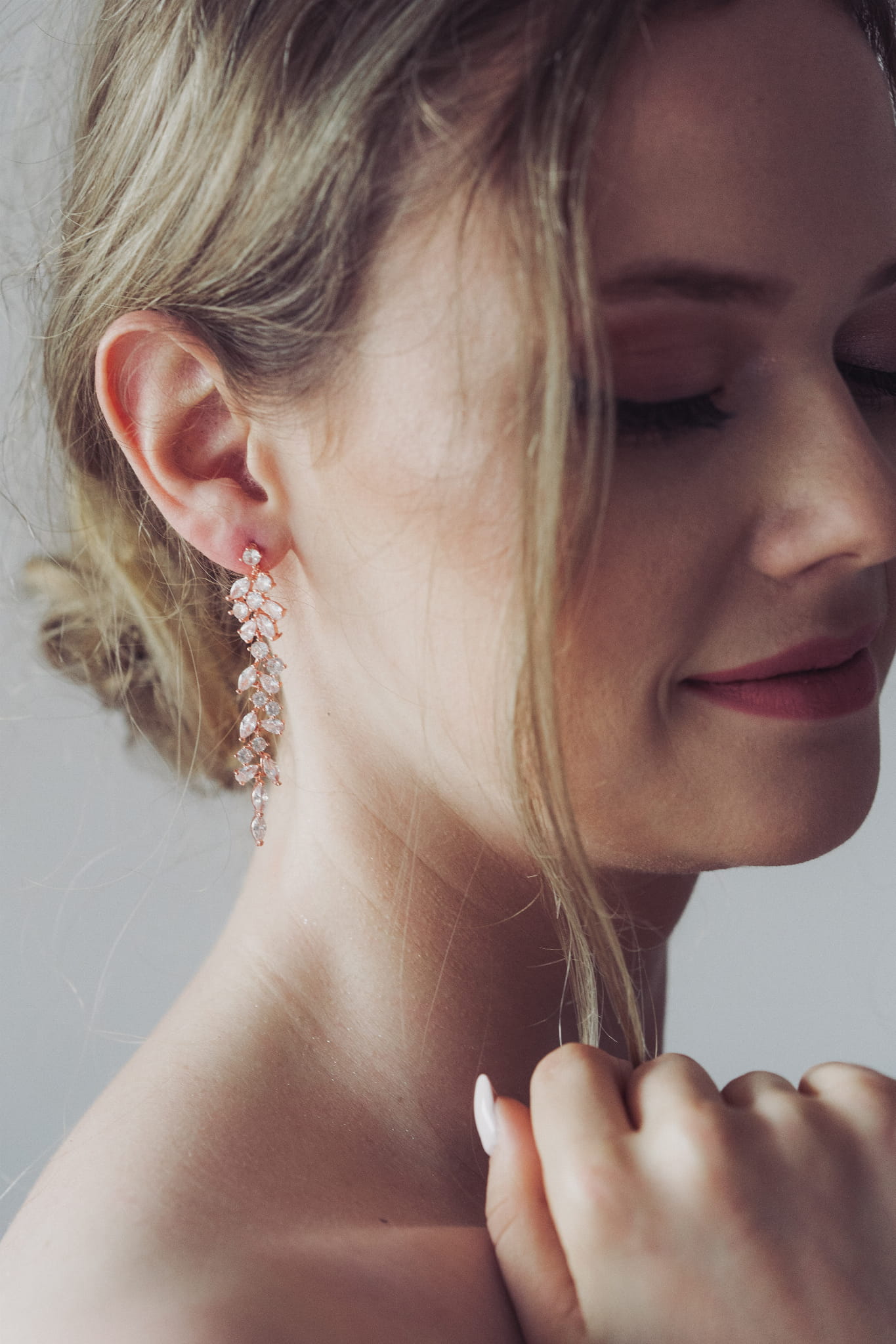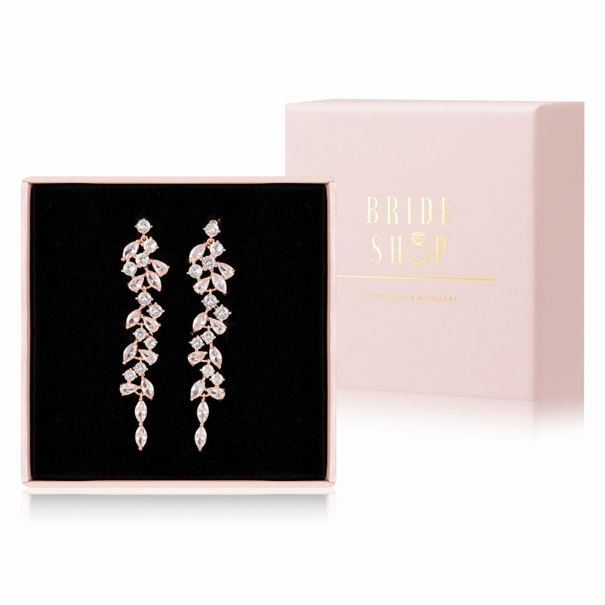 Kolczyki klipsy z cyrkoniami, stworzone na kształt kwiatów i listków sprawia, że biżuteria ta stworzy piękną stylizację zarówno z sukniami w stylu boho, jak i będzie doskonałym dodatkiem do bogato zdobionej sukni ślubnej.