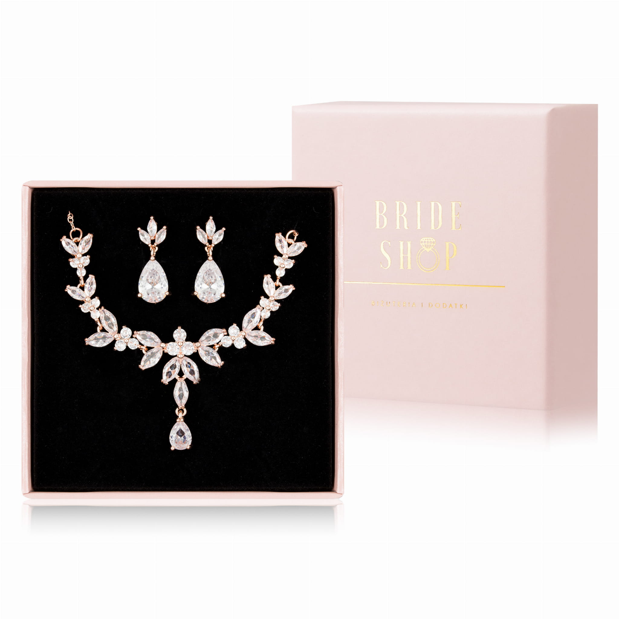 Komplet pięknej biżuterii z kolekcji Premium składający się z naszyjnika oraz kolczyków z motywem roślinnym.