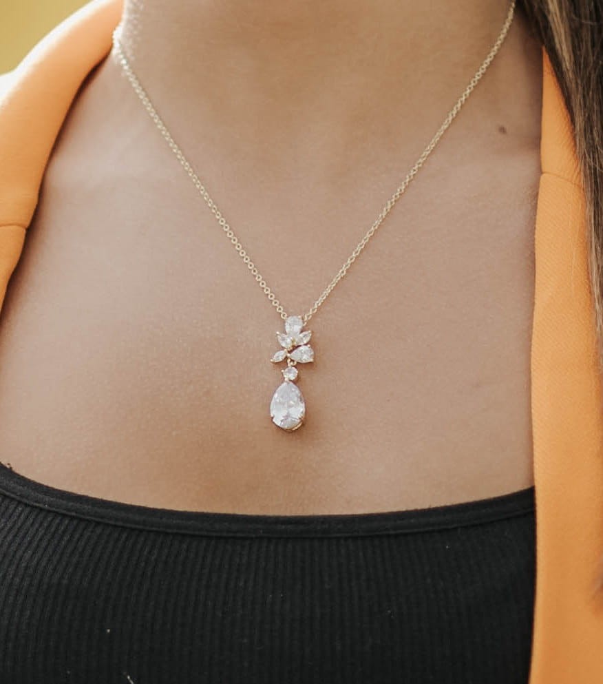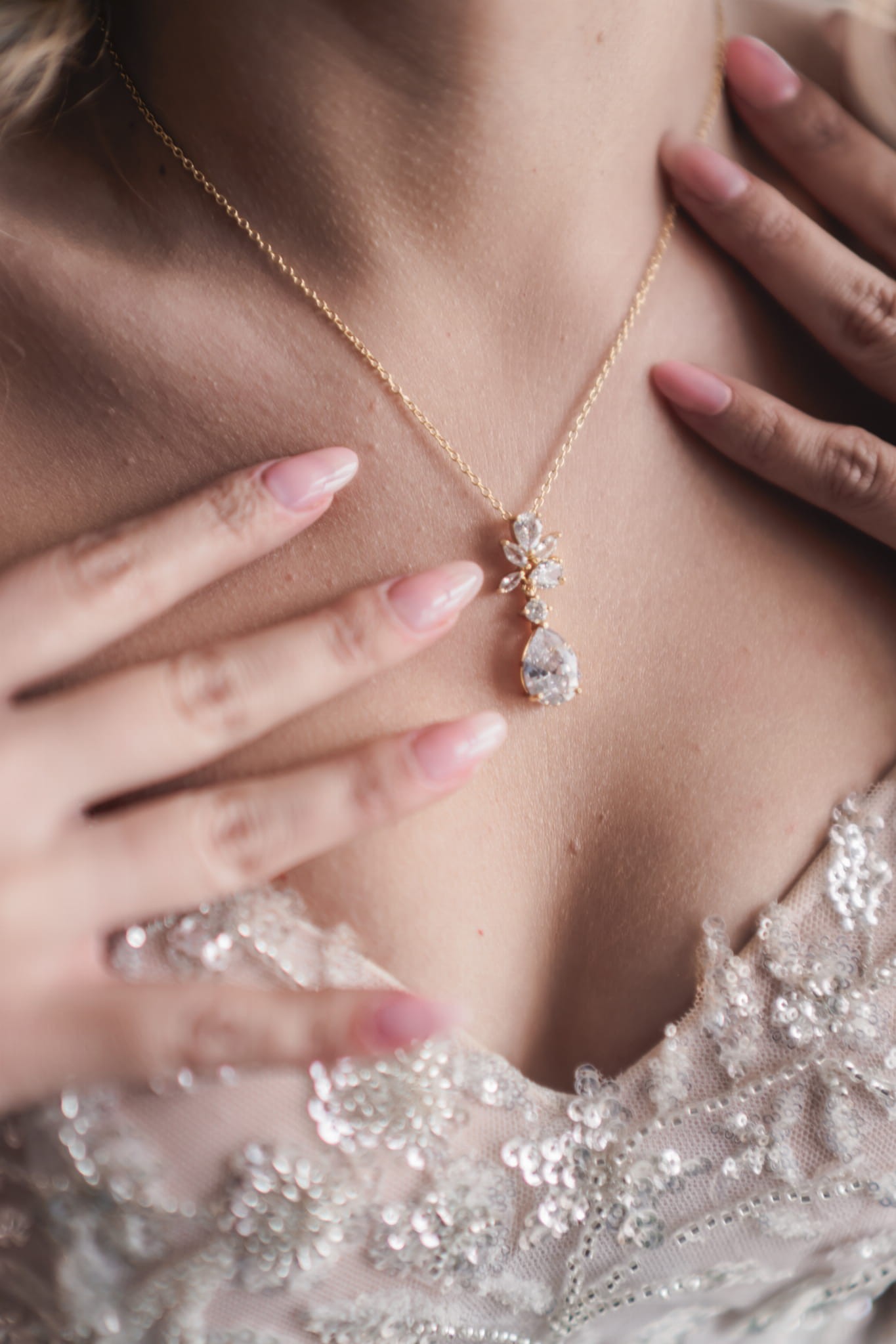 Wyjątkowy naszyjnik ślubny wysadzany cyrkoniami w oprawie w złotym kolorze.